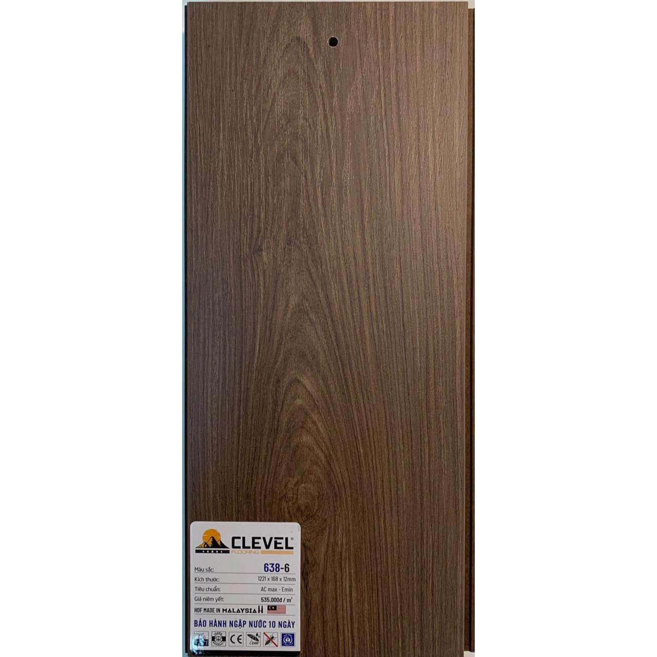 Sàn gỗ Clevel 638-6 thuộc dòng sản phẩm 12mm bản nhỡ HDF Made in Malaysia sử dụng lõi cốt siêu chịu nước tỉ trọng 900kg/m3 đanh chắc được sản xuất và đóng hộp trên dây chuyền công nghệ máy móc hiện đại bậc nhất hiện nay.